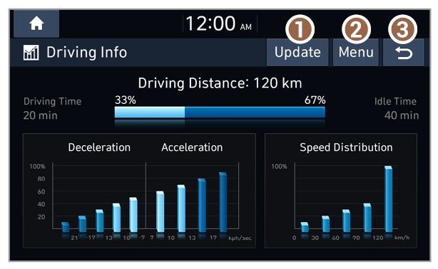 You can see your driving patterns by checking information such as driving time, distance, idling time ratio, and speed distribution. Use driving information for safe and economical vehicle operation.