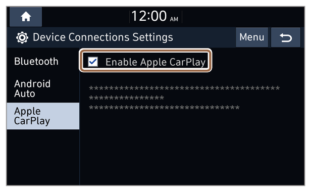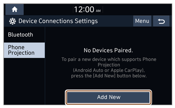 - On the Home screen, press All Menus > Apple CarPlay or Phone Projection.