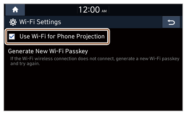 On the Home screen, press All Menus > Setup > Wi-Fi and press Use Wi-Fi for Phone Projection to activate it.