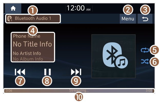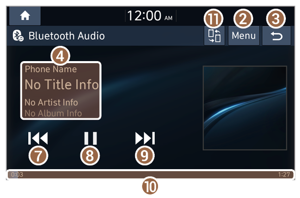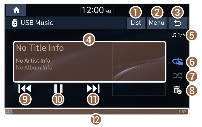 - Information about the song currently playing. Press a song′s artist or album information to access a list of songs by the artist or from the album playing.