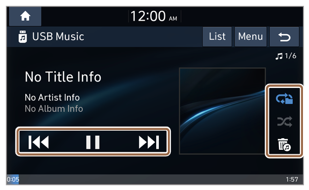 Use the buttons on the media player screen to control the music playback.