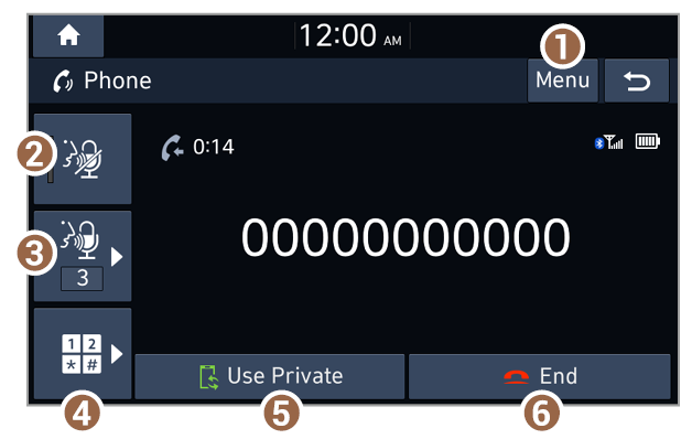 • You can activate privacy mode by pressing Privacy Mode on the incoming call pop-up window. In privacy mode, contact information will not be displayed. To deactivate privacy mode, press Menu > Privacy Mode on the Bluetooth phone screen (if equipped).