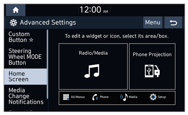 On the Home screen, press All Menus > Setup > Advanced and select an option to change.