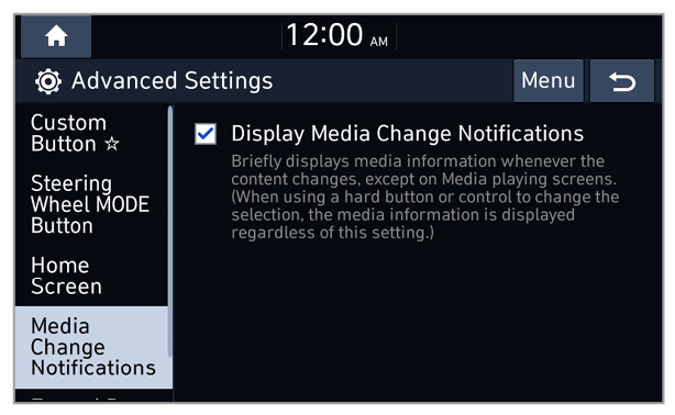 You can set to briefly display media information at the top of the screen when not on the main media screen. If you change the media item by using any controls on the control panel or steering wheel, media information will appear regardless of this setting.