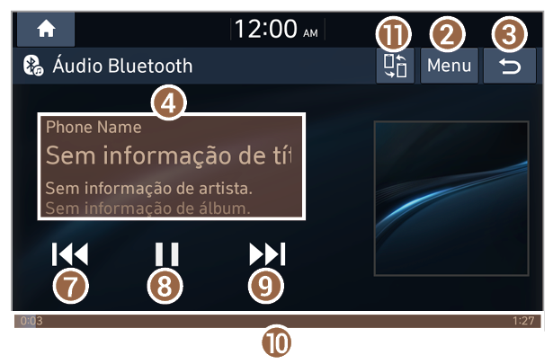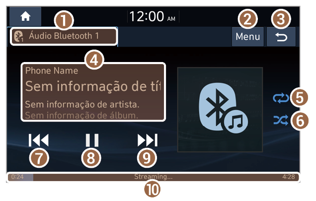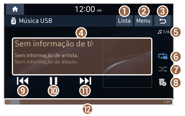 - Informações sobre a música em reprodução. Aperte no nome do artista ou nas informações do álbum para acessar uma lista de músicas por artista ou pelo álbum em reprodução.