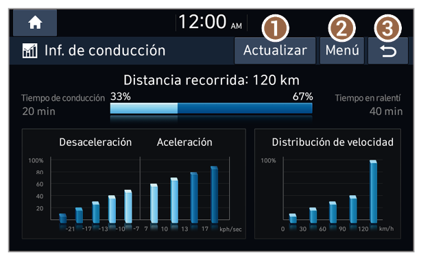 Permite ver sus patrones de conducción comprobando información tal como el tiempo de conducción, la distancia, la relación del tiempo de ralentí y la distribución de la velocidad. Utilice la información de conducción para operar el vehículo en forma segura y rentable.