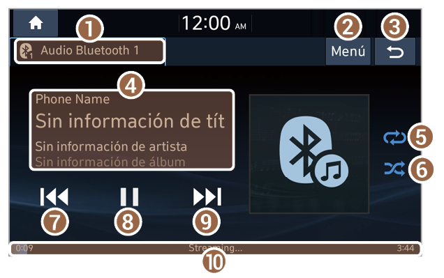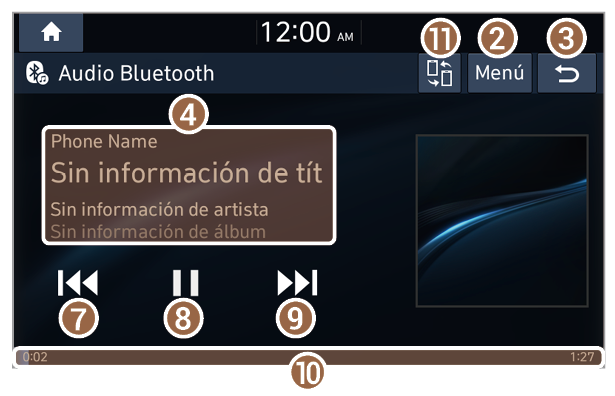- Información sobre la canción que se está reproduciendo actualmente. Presione la información del álbum o del autor de la canción para acceder a una lista de canciones o al álbum que se está reproduciendo actualmente.