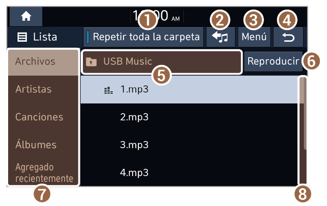 - Presione la pantalla para abrir una carpeta, mover a otra categoría o reproducir un archivo de música.