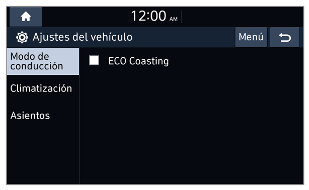 Este es un modo de conducción para incrementar la eficiencia de la energía del vehículo. Puede modificar el modo del control de climatización, el nivel de regeneración de energía de costa activo y otros ajustes.