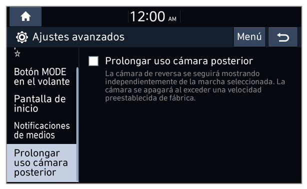 Puede configurar la pantalla de vista trasera para que permanezca activa incluso si cambia a cualquier otra posición que no sea “R” (reversa) luego de retroceder. Cuando cambia a “P” (estacionamiento) o conduce a una velocidad predeterminada o más rápido, la pantalla de vista trasera se desactiva y el sistema muestra la pantalla anterior en forma automática.