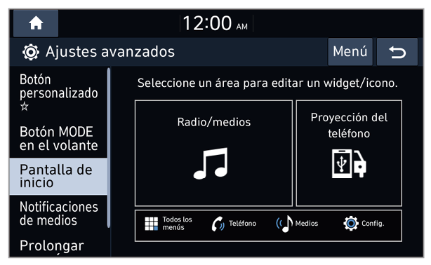 Puede cambiar los widgets y los menús que se muestran en la pantalla de inicio. Personalice la pantalla de inicio agregando sus menús favoritos. > Vea “Cambiar los widgets de la pantalla de inicio” o Cambiar los íconos del menú de la pantalla de inicio.”