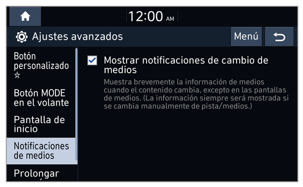 Puede configurar para mostrar brevemente la información de multimedia en la parte superior de la pantalla cuando no esté en la pantalla principal de multimedia. Si modifica el elemento de multimedia usando los controles del panel de control o el volante, la información de multimedia se mostrará independientemente de este ajuste.