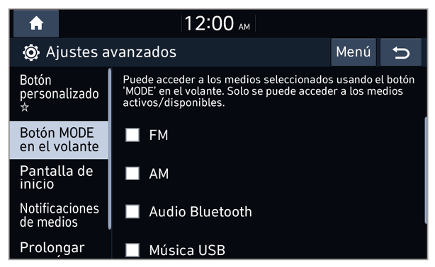 Puede seleccionar las funciones de radio o multimedia para acceder al presionar el botón Mode en el volante.
