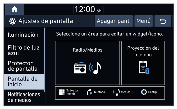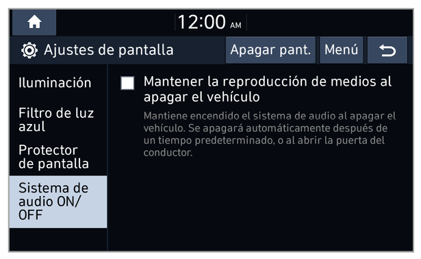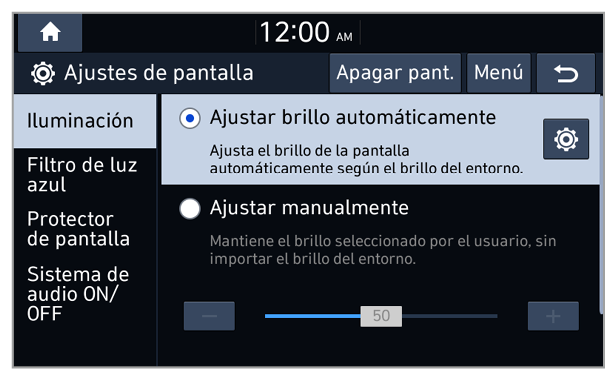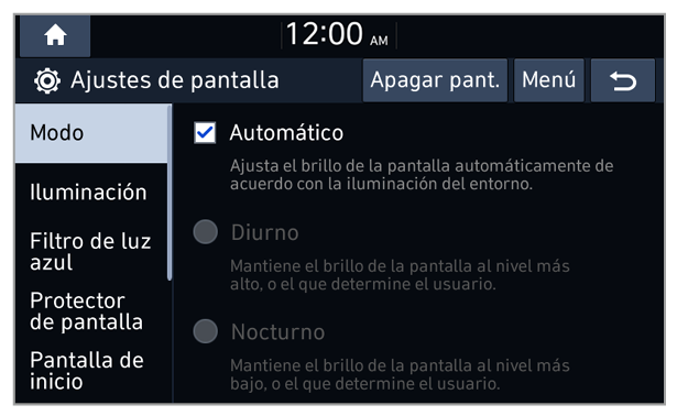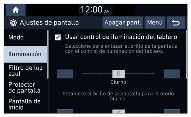 Puede configurar el brillo del sistema para que se ajuste según el brillo del tablero de instrumentos. Si esta función no está activada, puede ajustar el brillo para el modo diurno o nocturno según la configuración de la opción Modo.