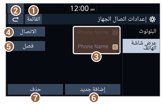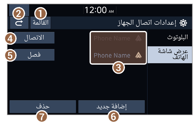 - قائمة أجهزة الهواتف الذكية المقترنة مع النظام. اضغط على اسم الهاتف الذكي للاتصال أو قطع الاتصال.