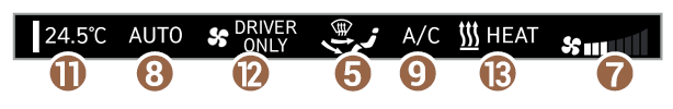 - DRIVER ONLY 모드 실행 표시. DRIVER ONLY 모드를 실행하면 운전석 에어컨과 히터만 작동합니다(사양 적용 시).