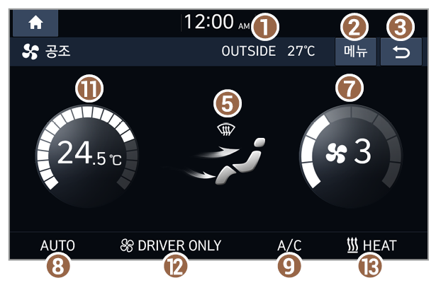 - 히터 및 에어컨 사용 방법은 차량의 사용설명서를 참조하세요.