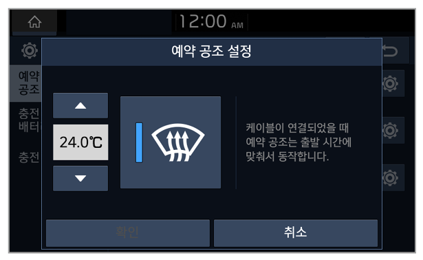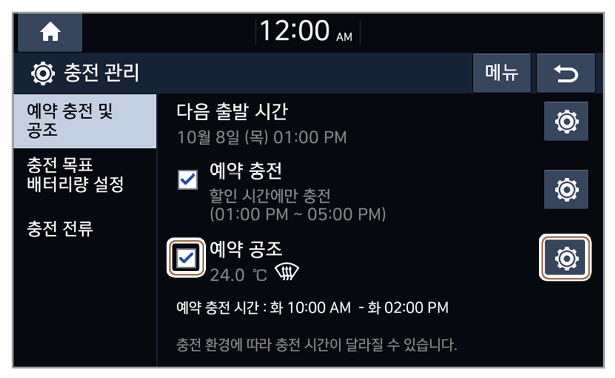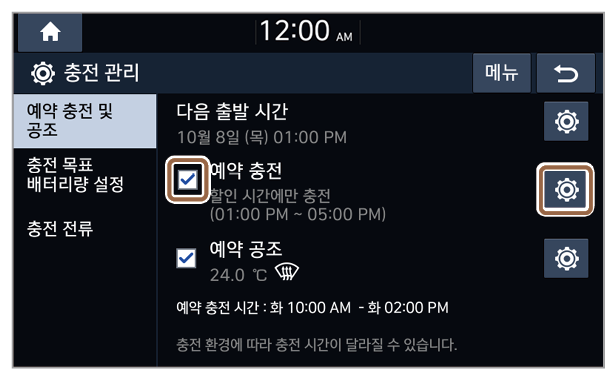 : 겨울철에 예약 충전 또는 예약 공조 기능을 사용하는 경우, 배터리 온도를 미리 올려 충전 및 주행 성능을 향상시킬 수 있습니다. 이 기능을 사용하면 배터리가 소모되어 주행거리가 짧아질 수 있습니다.
