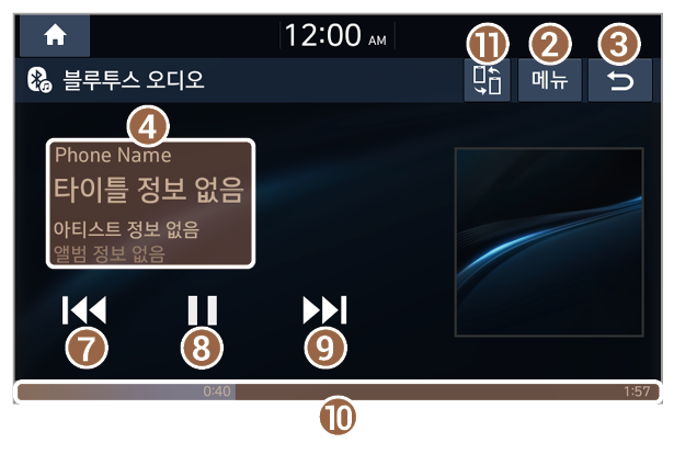 - 재생 중인 곡 정보. 아티스트나 앨범 정보를 누르면 현재 재생 중인 곡이 있는 아티스트 또는 앨범 목록으로 이동합니다.