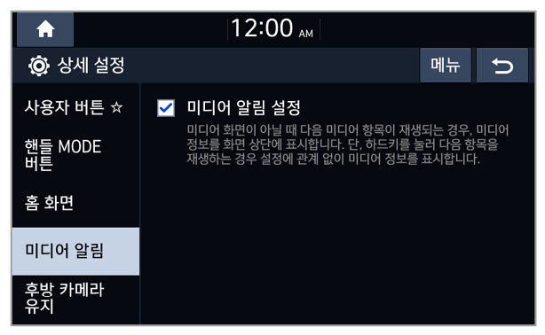 미디어 재생 화면이 아닌 경우 재생 항목이 바뀌면 화면 상단에 미디어 정보가 표시되도록 설정할 수 있습니다. 조작 패널 또는 스티어링 휠을 사용해 재생 항목을 바꾸면 설정과 관계없이 미디어 정보가 표시됩니다.