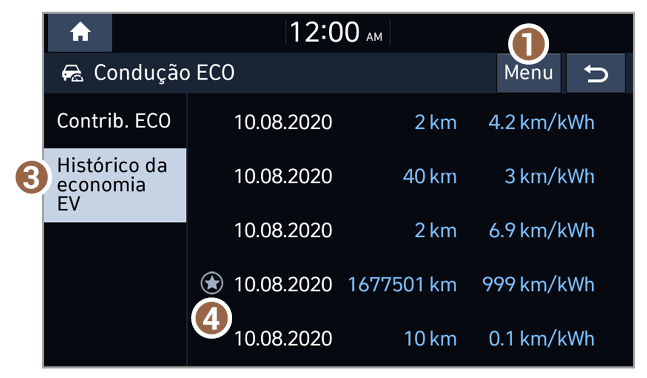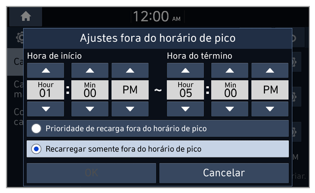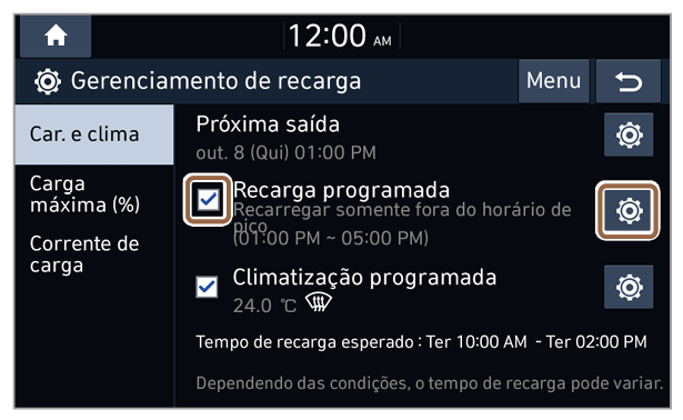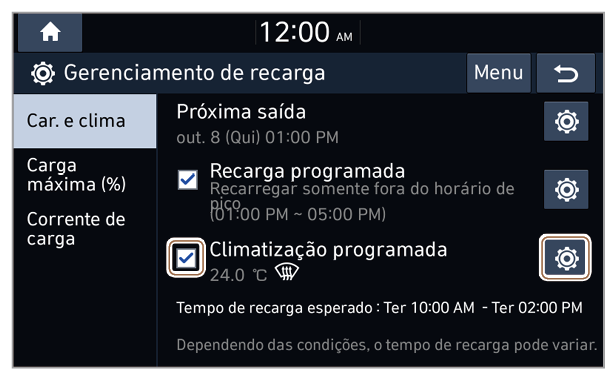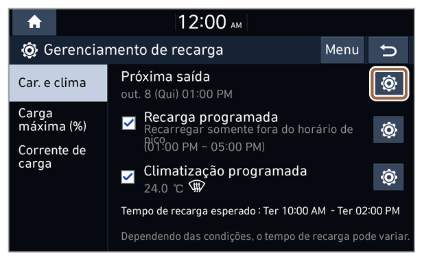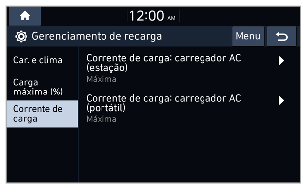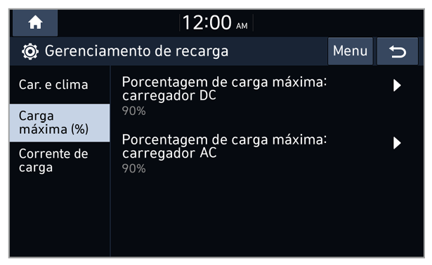 Para alterar as configurações dos recursos para veículo elétrico, na tela inicial, pressione Todos os menus > EV > Ajustes EV.