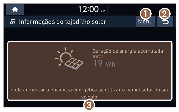 - Na tela inicial, pressione Todos os menus > Híbrido > Fluxo de energia > Informações do tejadilho solar.