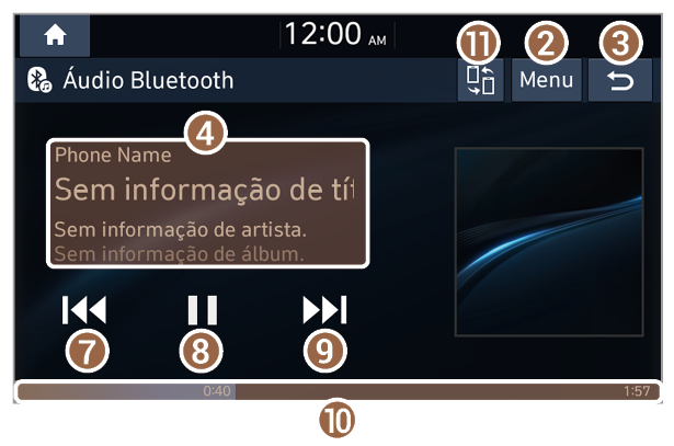 - Informações sobre a música em reprodução. Aperte no nome do artista ou nas informações do álbum para acessar uma lista de músicas por artista ou pelo álbum em reprodução.