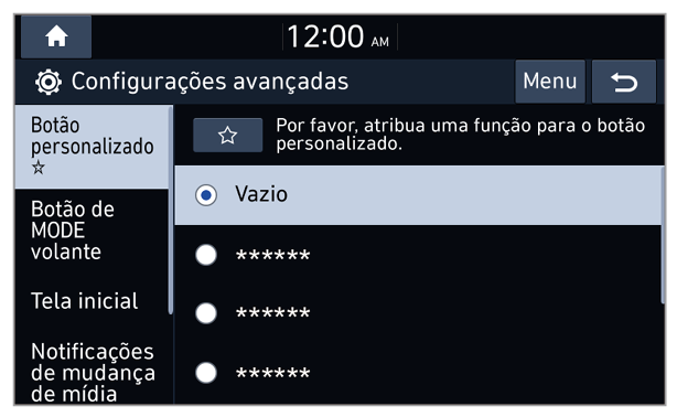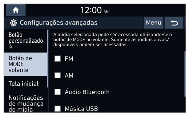 Você pode selecionar as funções de rádio/mídia a serem acessadas quando pressionar o botão Modo no volante.