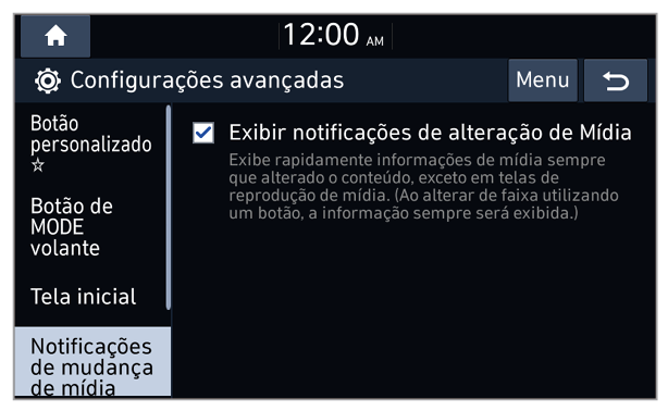Você pode definir para exibir brevemente as informações de mídia na parte superior da tela quando não estiver na tela de mídia principal. Se você alterar o item de mídia usando qualquer um dos controles no painel de controle ou no volante, as informações de mídia serão exibidas independentemente desta configuração.