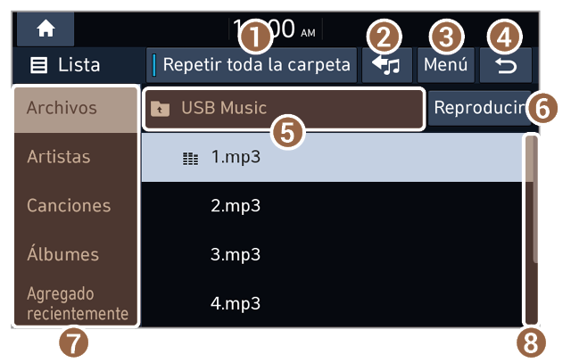 - Presione la pantalla para abrir una carpeta, mover a otra categoría o reproducir un archivo de música.