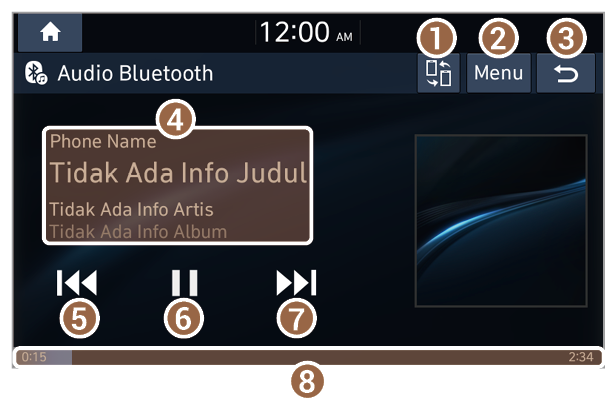 - Informasi tentang lagu yang saat ini diputar. Tekan informasi artis atau album lagu untuk mengakses daftar lagu menurut artis atau dari pemutaran album.