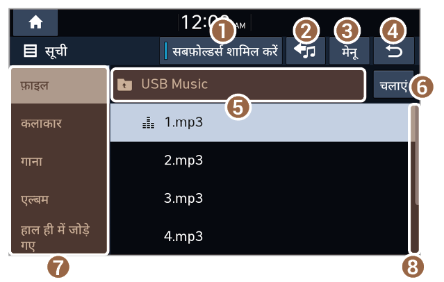 फ़ाइल सूची पर संगीत फ़ाइलों के लिए खोजना
