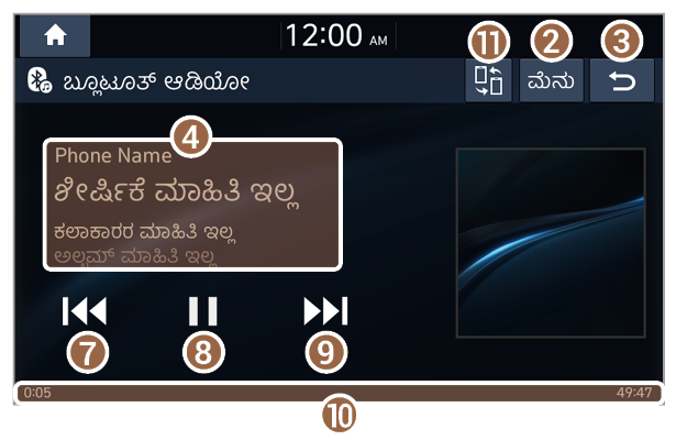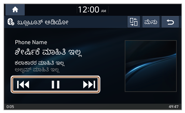 ಸಂಗೀತ ಪ್ಲೇ ಬ್ಯಾಕ್ ಅನ್ನು ನಿಯಂತ್ರಿಸಲು ಮೀಡಿಯಾ ಪ್ಲೇಯರ್ ಸ್ಕ್ರೀನ್ ನಲ್ಲಿರುವ ಬಟನ್ ಗಳನ್ನು ಬಳಿಸಿ.