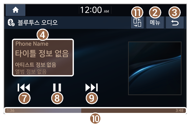 - 재생 중인 곡 정보. 아티스트나 앨범 정보를 누르면 현재 재생 중인 곡이 있는 아티스트 또는 앨범 목록으로 이동합니다.