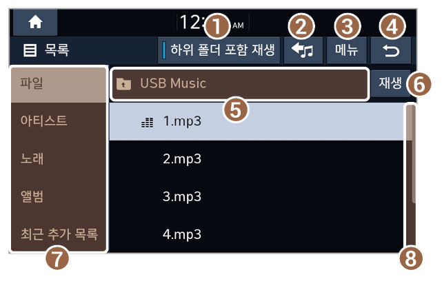 - 현재 재생 목록 내의 모든 하위 폴더에 포함된 파일을 재생하도록 설정할 수 있습니다(사양 적용 시).