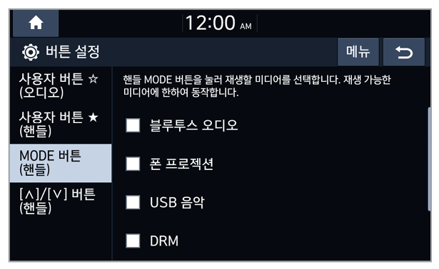 스티어링 휠에서 모드 버튼을 눌러 실행할 방송/미디어 기능을 선택할 수 있습니다.