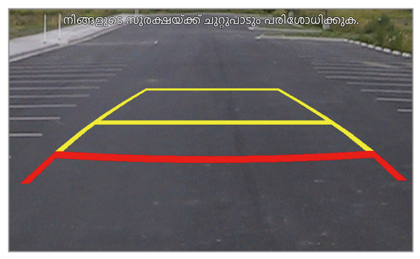 റിയർ വ്യൂ സ്ക്രീനിൽ കാണിച്ചിരിക്കുന്ന ദൂരം യഥാർത്ഥ ദൂരത്തിൽ നിന്ന് വ്യത്യസ്തമായിരിക്കാം. സുരക്ഷയ്ക്കായി, നിങ്ങളുടെ വാഹനത്തിന്റെ പിൻഭാഗവും, ഇടത്, വലത് വശങ്ങളും നേരിട്ട് പരിശോധിക്കുന്നത് ഉറപ്പാക്കുക.
