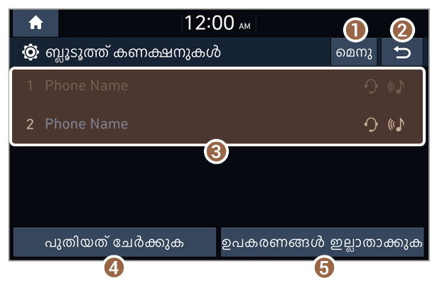 Bluetooth ഉപകരണങ്ങൾ കണക്റ്റ് ചെയ്യുന്നതിന് മുമ്പ് നിങ്ങളുടെ വാഹനം ഒരു സുരക്ഷിത സ്ഥലത്ത് പാർക്ക് ചെയ്യുക. അശ്രദ്ധമായ ഡ്രൈവിംഗ് വാഹനാപകടത്തിന് കാരണമാവുകയും വ്യക്തിഗത പരിക്കുകളിലേക്കോ മരണത്തിലേക്കോ നയിക്കുകയും ചെയ്യാം.