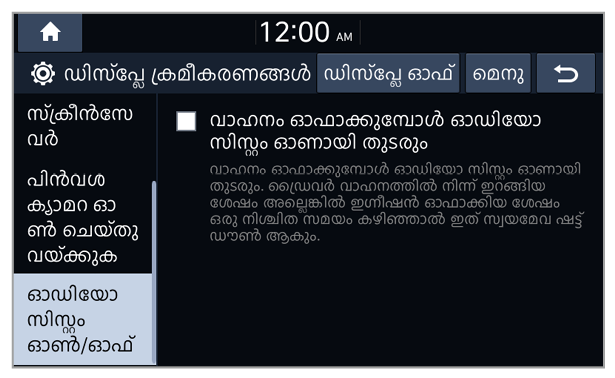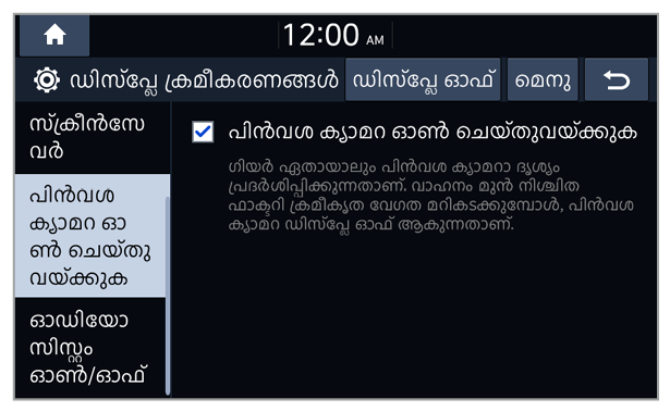- Auto-illumination: ആംബിയന്റ് ലൈറ്റിംഗ് സാഹചര്യങ്ങൾ അല്ലെങ്കിൽ ഹെഡ്ലാമ്പ് സ്റ്റാറ്റസ് അനുസരിച്ച് സിസ്റ്റം തെളിച്ചം ക്രമീകരിച്ചിരിക്കുന്നു.