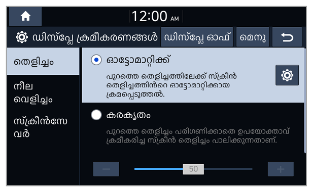 ആംബിയന്റ് ലൈറ്റിംഗ് സാഹചര്യങ്ങളോ ഹെഡ്ലാമ്പ് നിലയോ അനുസരിച്ച് നിങ്ങൾക്ക് സിസ്റ്റം തെളിച്ചം പകൽ മോഡിലേക്കോ രാത്രി മോഡിലേക്കോ മാറുന്നതിന് സജ്ജമാക്കാവുന്നതാണ്. ഓരോ മോഡിലും സ്ക്രീൻ തെളിച്ചം ക്രമീകരിക്കാൻ,