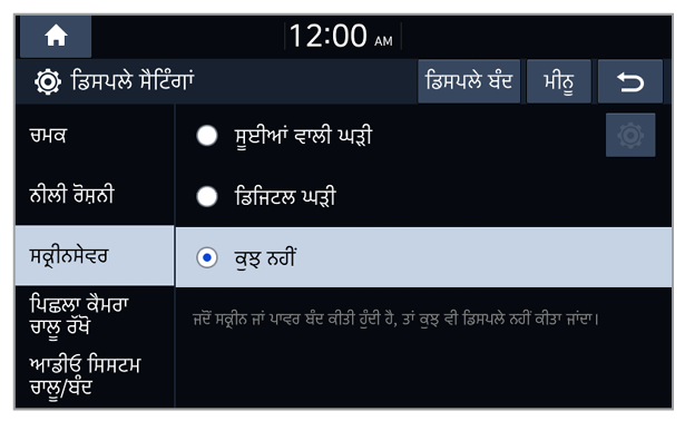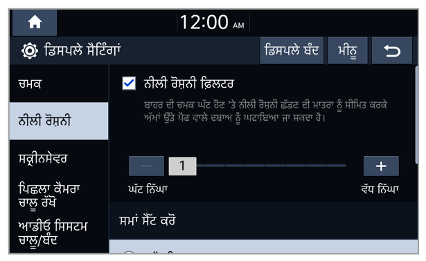 ਤੁਸੀਂ ਇੰਸਟਰੂਮੈਂਟ ਕਲੱਸਟਰ ਦੀ ਚਮਕ ਅਨੁਸਾਰ ਸਿਸਟਮ ਚਮਕ ਨੂੰ ਅਨੁਕੂਲਿਤ ਕਰਨ ਲਈ ਸੈੱਟ ਕਰ ਸਕਦੇ ਹੋ। ਜੇਕਰ ਇਹ ਸੁਵਿਦਾ ਅਸਕ੍ਰਿਆ ਹੋ ਗਈ ਹੈ, ਤਾਂ ਤੁਸੀਂ Dimming ਵਿਕਲਪ ਵਿੱਚ ਆਪਣੀ ਸੈਟਿੰਗ ਅਨੁਸਾਰ ਦਿਨ ਜਾਂ ਰਾਤ ਮੋਡ ਵਾਸਤੇ ਚਮਕ ਨੂੰ ਅਨੁਕੂਲ ਕਰ ਸਕਦੇ ਹੋ।