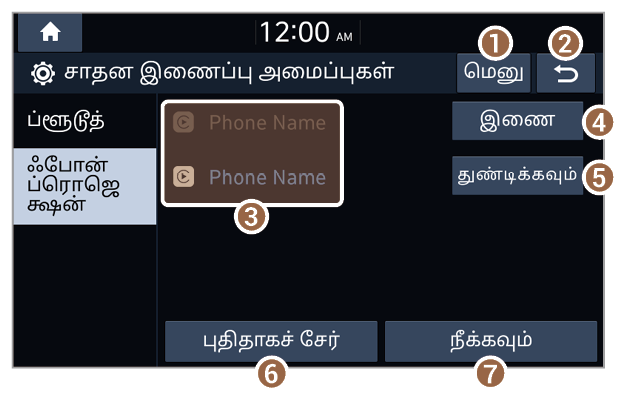 - ஸ்மார்ட்போனுடன் வழங்கப்பட்ட கேபிள் வழியாக உங்கள் வாகனத்தில் உள்ள USB போர்ட்டுடன் உங்கள் ஸ்மார்ட்போனை இணைக்கவும் அல்லது ஃபோன் ப்ரொஜெக்ஷன் சாதனங்களின் பட்டியலை அணுகி உங்கள் ஸ்மார்ட்போனைத் தேர்ந்தெடுக்கவும்.