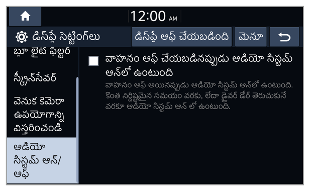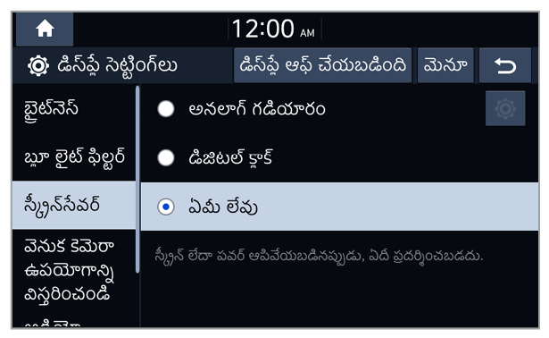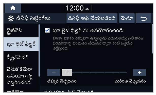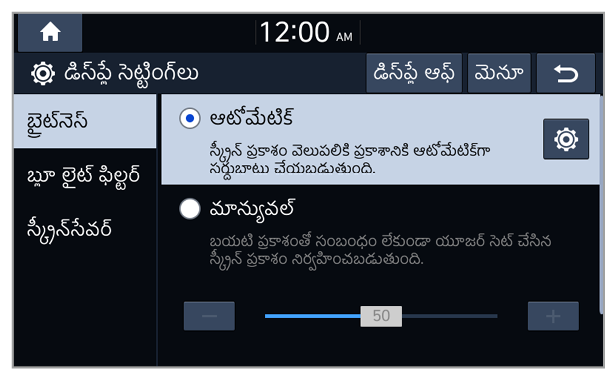 మీరు పరిసర లైటింగ్ పరిస్థితులు లేదా హెడ్ల్యాంప్ స్టేటస్కు అనుగుణంగా, డే మోడ్ లేదా నైట్ మోడ్కు మార్చబడే సిస్టమ్ బ్రైట్నెస్ను సెట్ చేయవచ్చు. ప్రతి మోడ్లో స్క్రీన్ బ్రైట్నెస్ స్థాయిని సర్దుబాటు చేయడానికి,