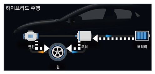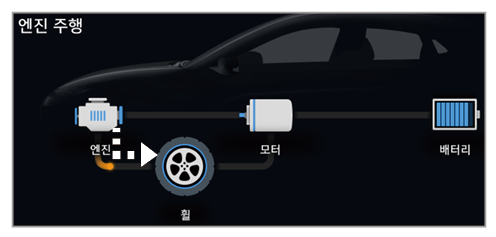 차량의 주행 상태에 따른 엔진과 모터, 배터리 사이의 에너지 전달 상태를 확인할 수 있습니다.