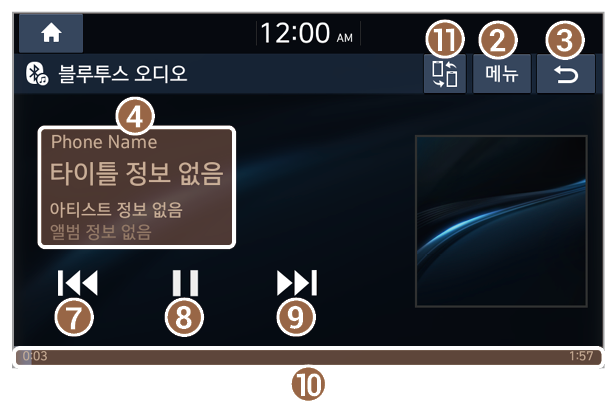 - 재생 중인 곡 정보. 아티스트나 앨범 정보를 누르면 현재 재생 중인 곡이 있는 아티스트 또는 앨범 목록으로 이동합니다.