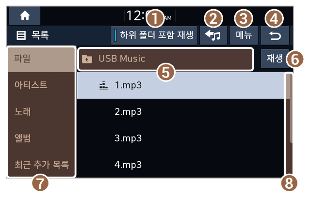 - 현재 재생 목록 내의 모든 하위 폴더에 포함된 파일을 재생하도록 설정할 수 있습니다.(사양 적용 시)