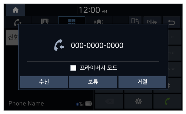 전화 수신 알림창에서 프라이버시 모드를 눌러 개인 정보 잠금 모드를 실행할 수 있습니다. 이 모드를 실행하면 연락처 정보가 화면에 표시되지 않습니다. 개인 정보 잠금 모드를 해제하려면 블루투스 전화 화면에서 메뉴>프라이버시 모드를 누르세요.(사양 적용 시)