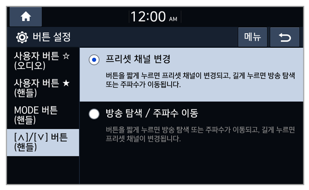 스티어링 휠에서 모드 버튼을 눌러 실행할 방송/미디어 기능을 선택할 수 있습니다.