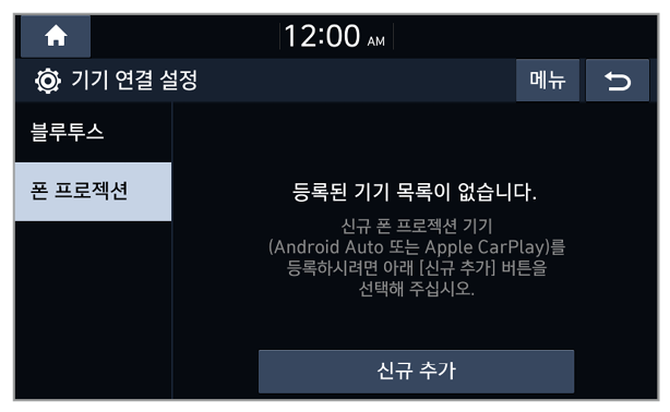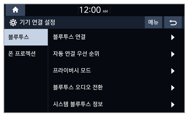 블루투스 기기를 관리하거나 사용 환경을 설정할 수 있습니다. 또한 시스템과 스마트폰을 연결해 시스템 화면에서 스마트폰의 앱을 제어할 수 있도록 폰 프로젝션 기능을 활성화할 수 있습니다.