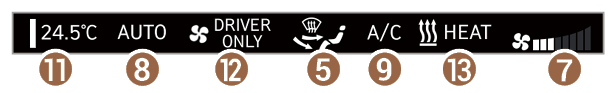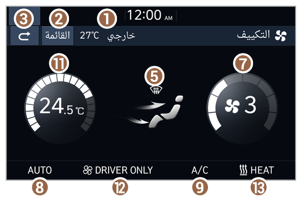 - تم تنشيط وضع "السائق فقط". في وضع "السائق فقط"، سيتم استخدام تكييف الهواء أو التدفئة لمقعد السائق فقط (إذا كانت السيارة مزودة بذلك).